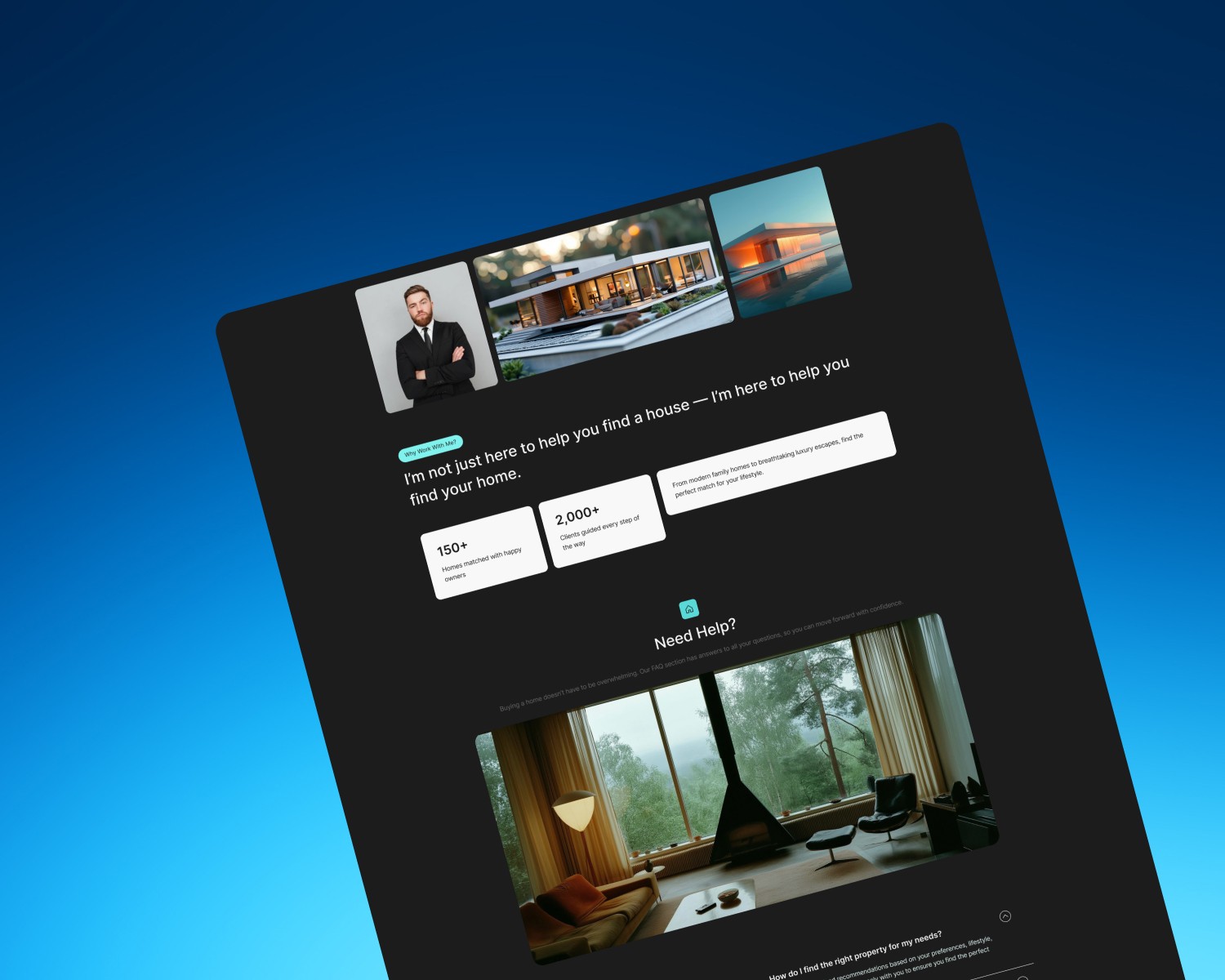 Sections for featured properties, client support, and FAQs