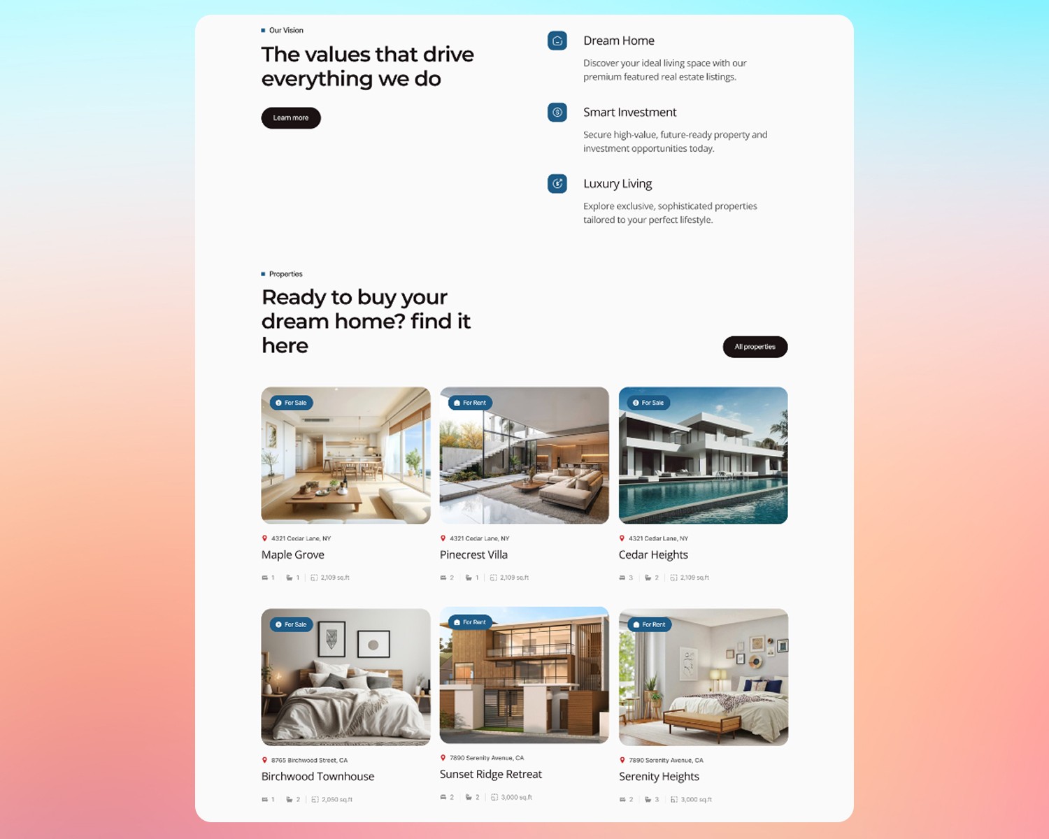 Intuitive navigation so users can easily browse listings, filter options, or contact an agent