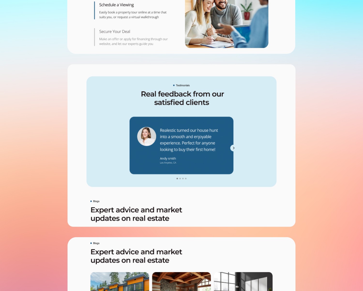Dedicated sections for neighborhoods, client testimonials, and real-time property updates